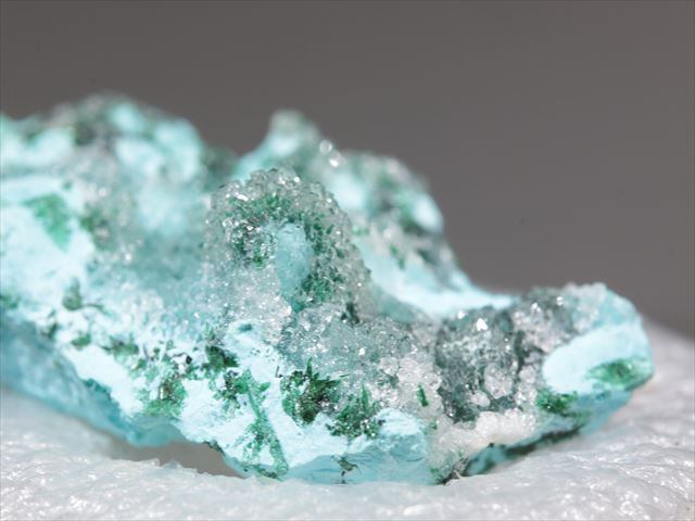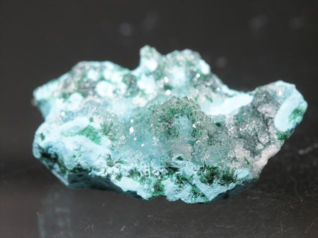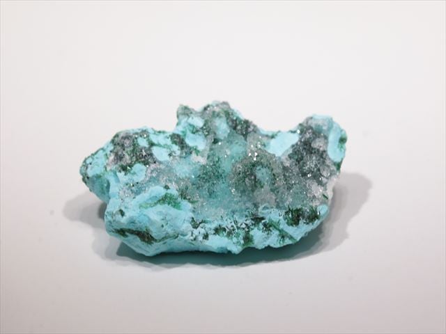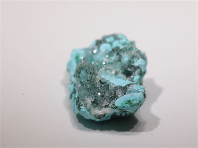 非常に透明度の良い、美しいドゥルーシー状のクォーツがクリソコラとマラカイト全体を包んで表面がキラキラでとても美しいです。
